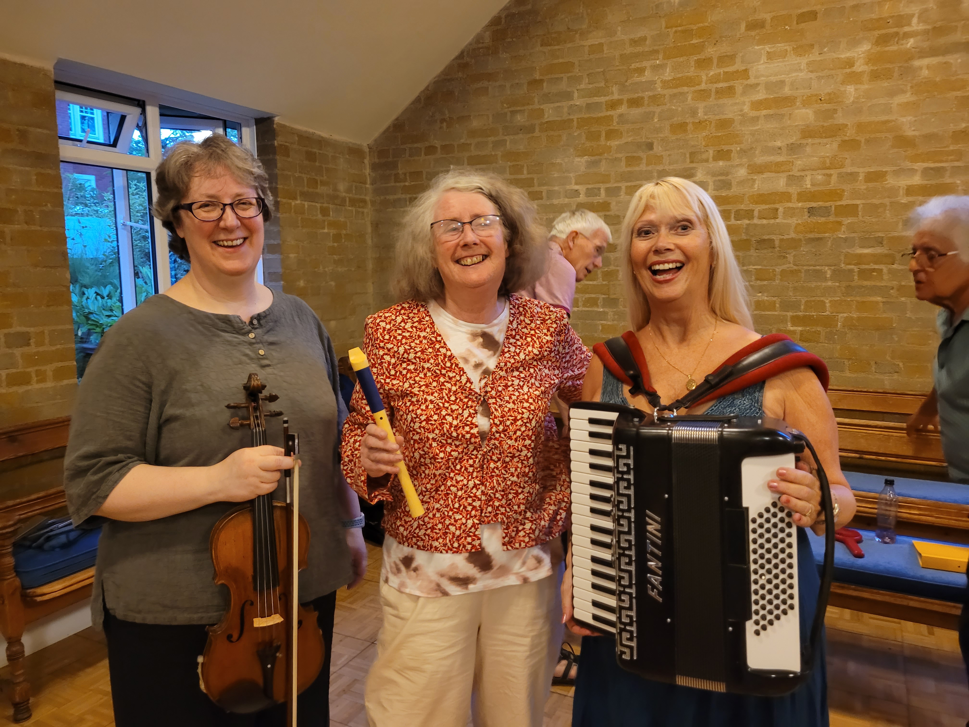 Friday 20th June 2025 – saw us at the Friends Meeting House entertaining our friends and family with our Midsummer Music. We were joined for this by Canora, a Ceilidh Trio; the accordianist is our very own Honora.